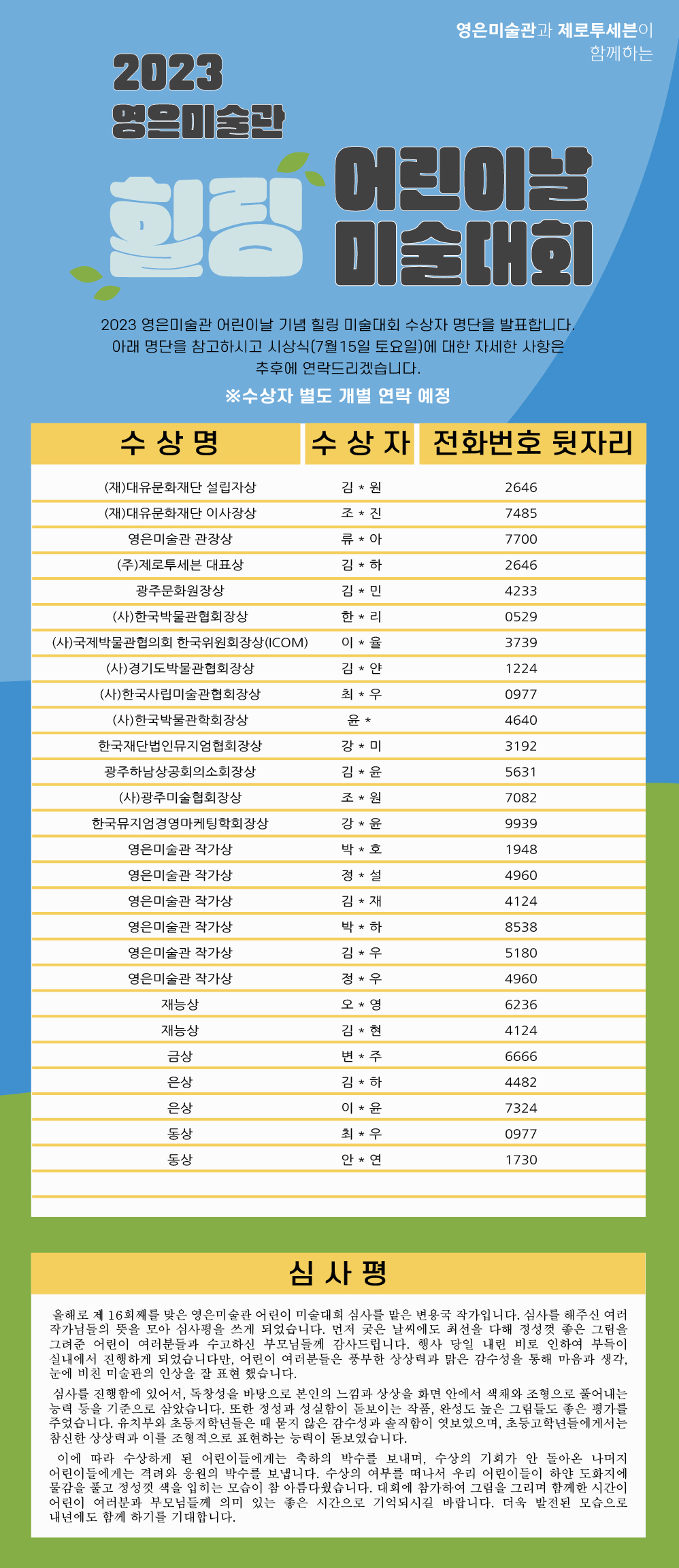 2023 영은미술관 어린이날 기념 힐링 미술대회 수상자 명단을 발표합니다.